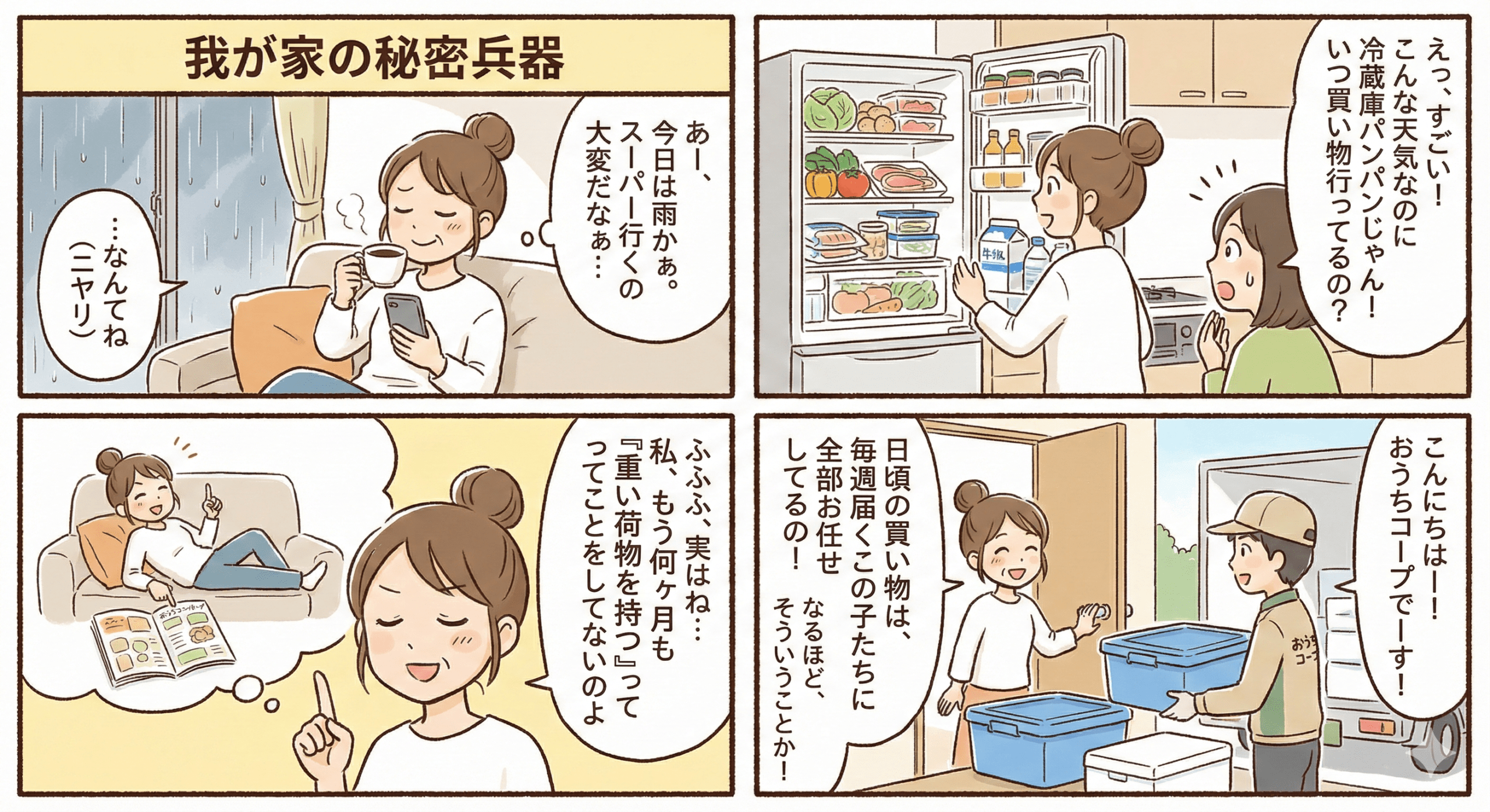 実は私、日頃の買い物は、毎週届くおうちコープに任せています。あとは朝市。